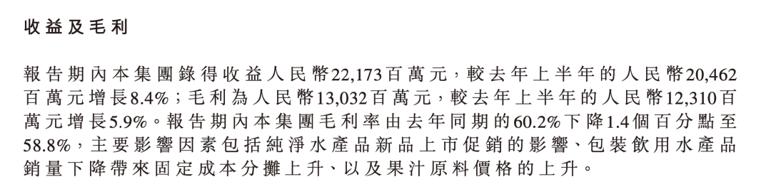 即使是今年备受冲击的农夫山泉,2024年上半年毛利率也保持在了58.8%,包装饮用水仍是其中收益主力。