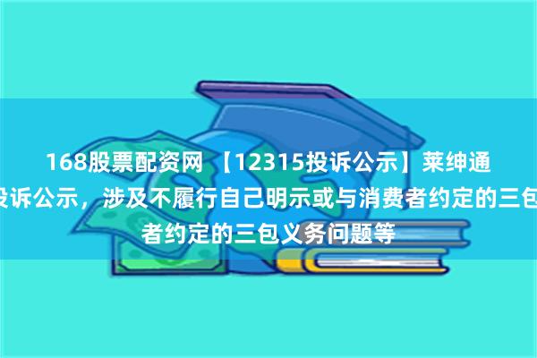 168股票配资网 【12315投诉公示】莱绅通灵新增2件投诉公示,涉及不履行自己明示或与消费者约定的三包义务问题等